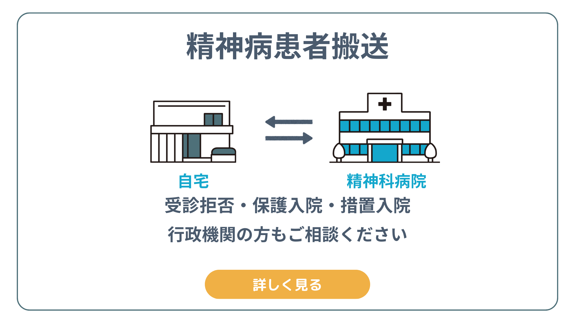 可能です。搬送専用の器材を準備いたしますが、大柄な体格であったり、在宅医療措置がある場合は増員対応となる場合があります。